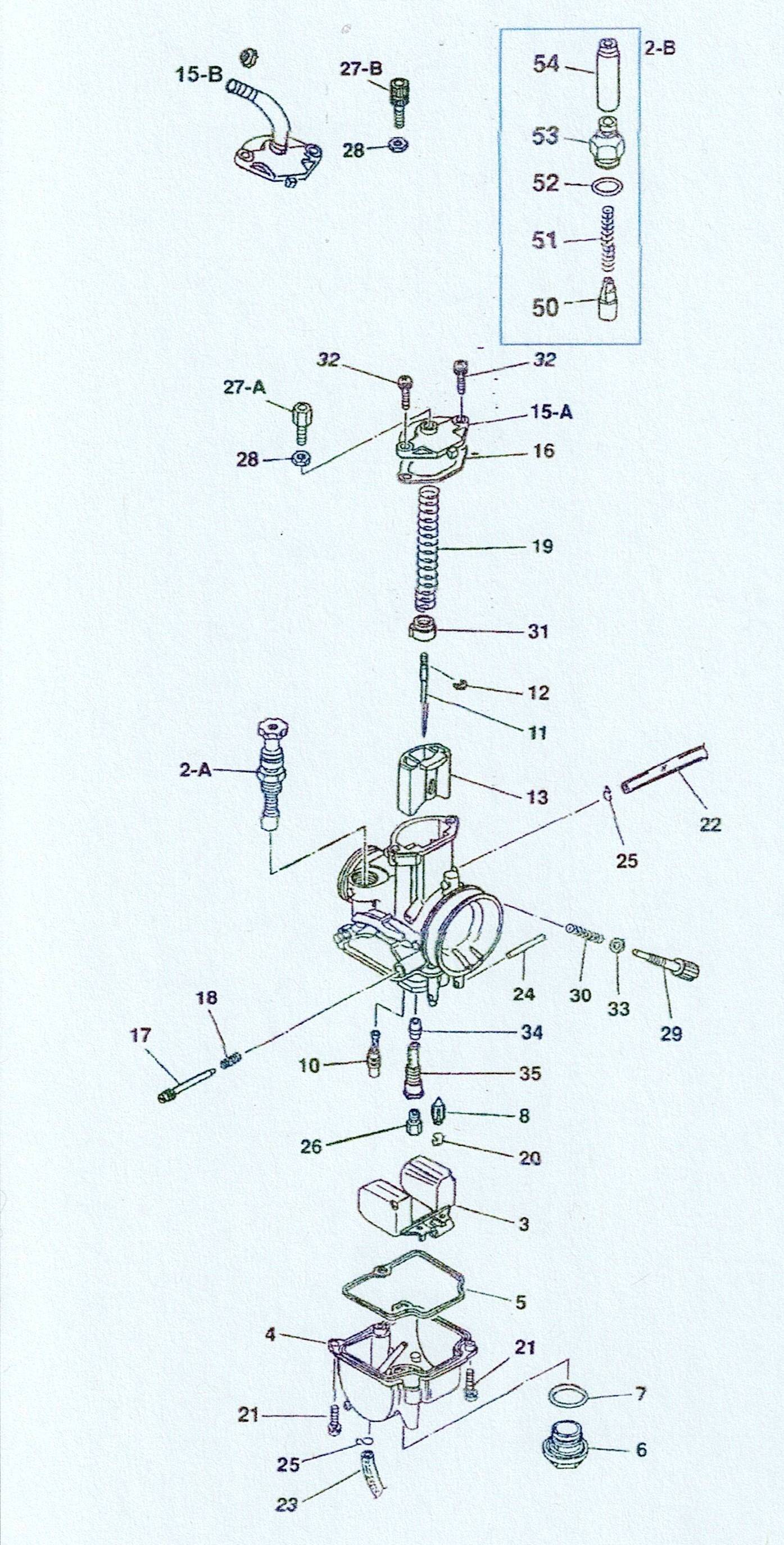 We carry and sell virtually every part for the K100 series of OKO carburetors. Parts for the larger K-104 series though not yet listed here, are all available available. K-104s do use the same air screw and pull choke. Also, Keihin's 28mm PWK can use most of OKO's parts, excluding the slide, the idle screw and the needle jet. Order K-100 parts just below this text. Accessories are listed below parts