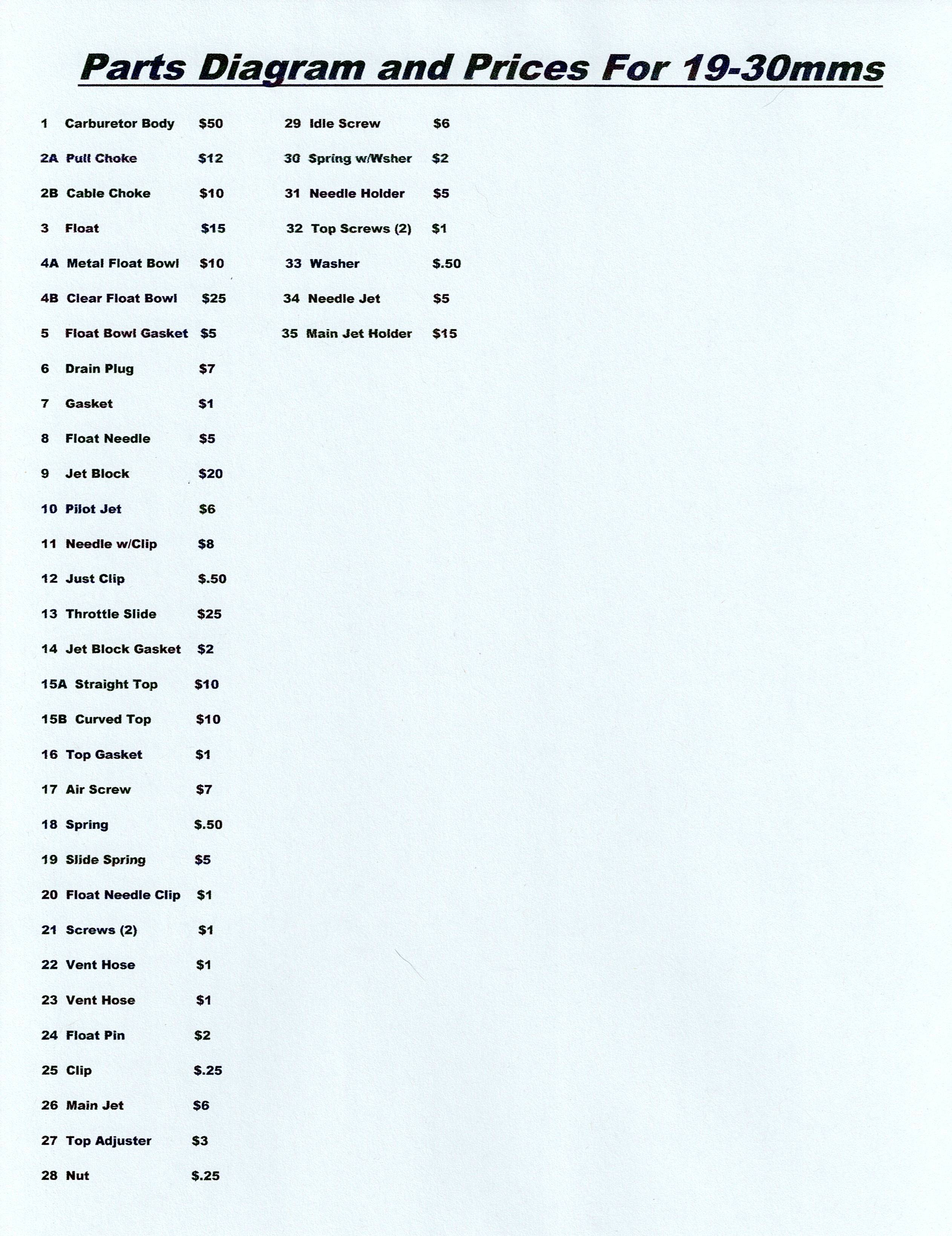 We carry several Needles for the K-101 series. The stock needles for the various sizes from 30mm to 21 are available. Note: To date, we have used the 28mm, JJH needle for all applications from 19 to 28mm. We suggest you try the JJH if you find the stock needle has too much taper, giving a rich mixture towards 3/4 throttle.